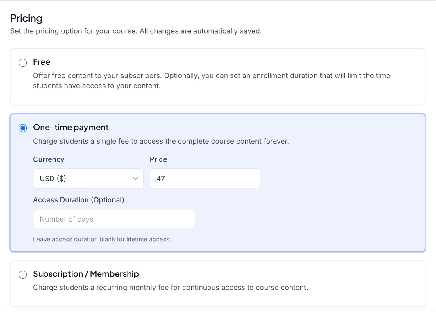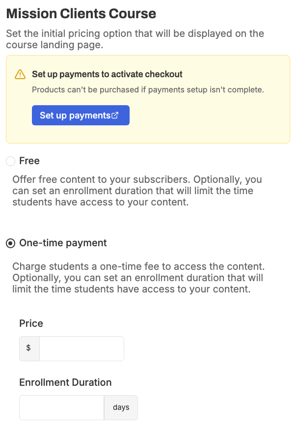 Publish and sell however you want. You can offer your course for free, charge for it one-time, or have a payment plan.